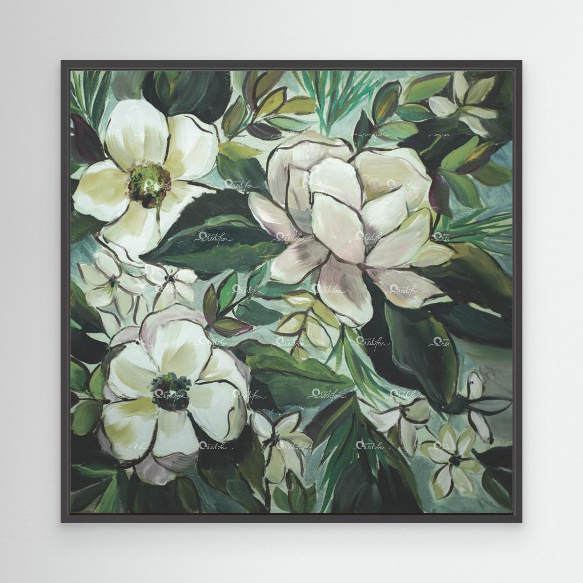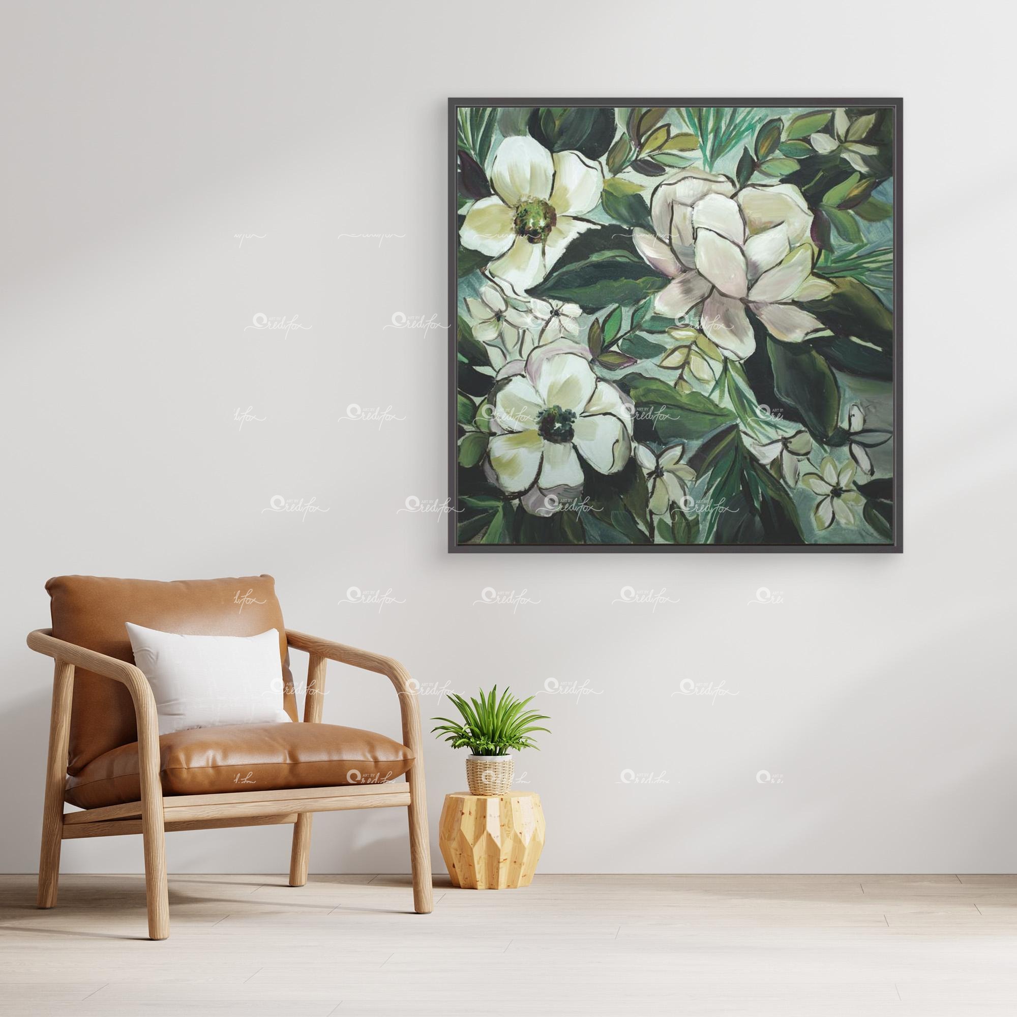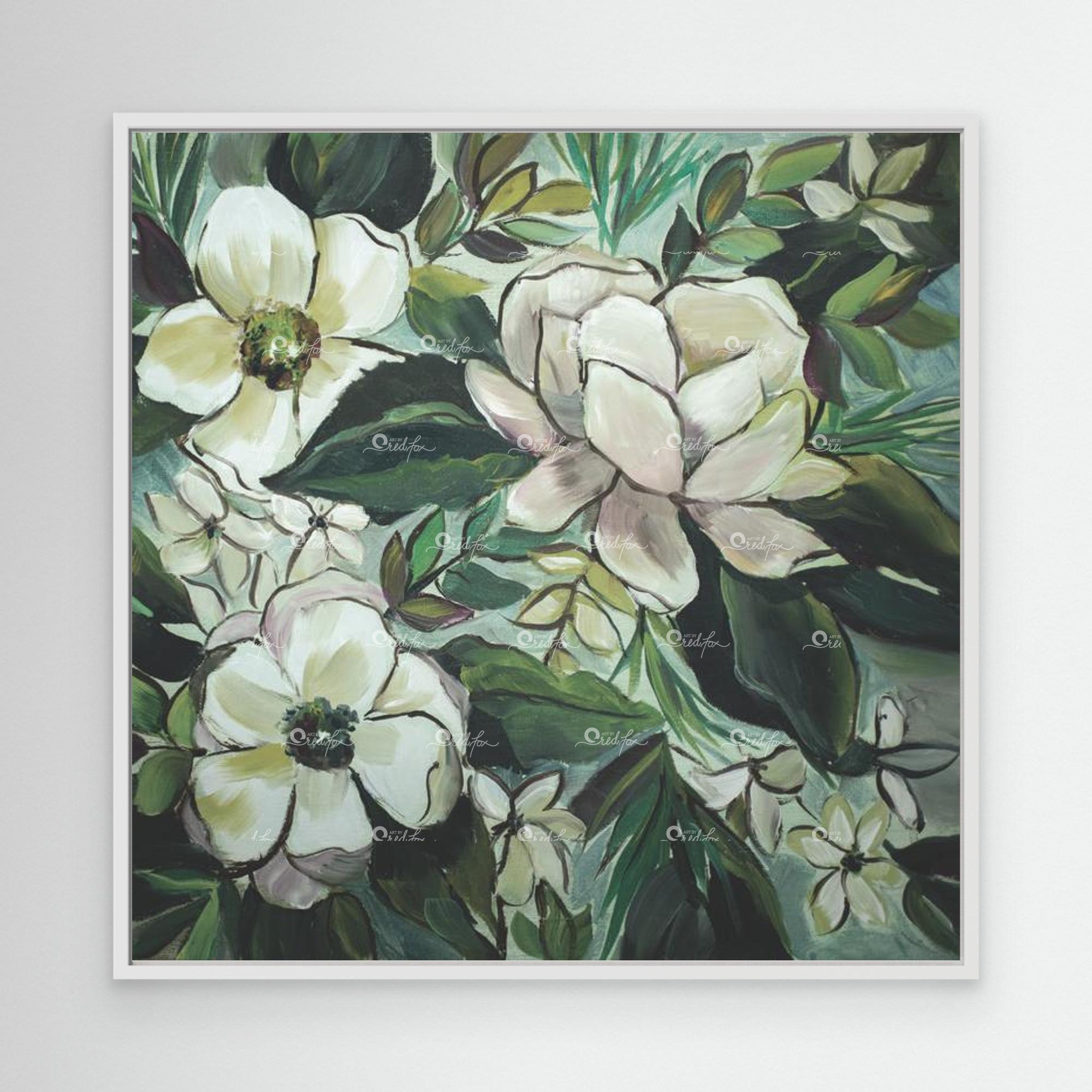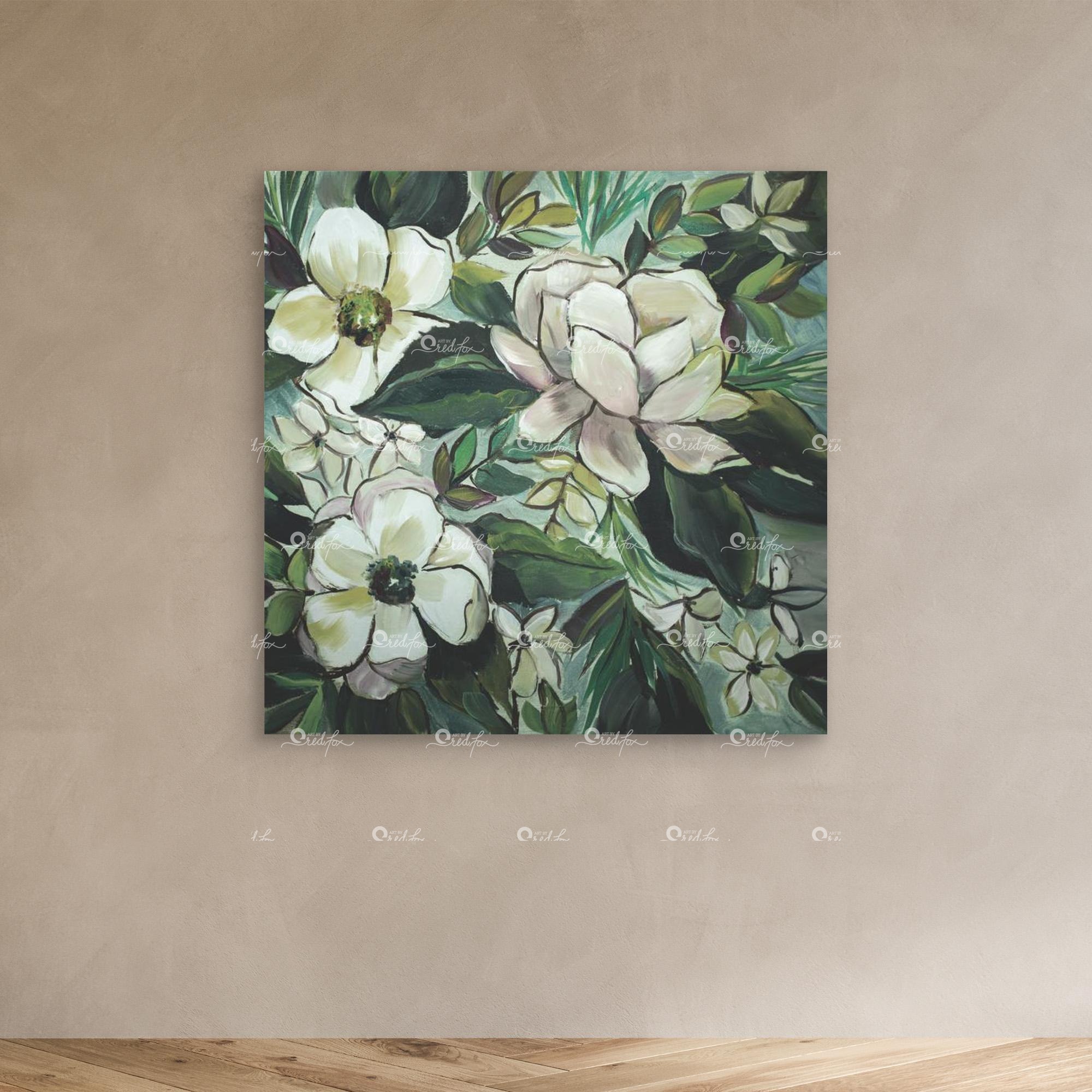 Note from the artist:“When I painted this, I was actually super frustrated. I needed something to help me simmer down. I pulled out my favorite colors of paint and began painting magnolias in spite of my feelings. Why? Because I love magnolias so much. They have calming lines, and are beautiful to behold. Did it work to calm me down? Yes. Yes, it did. Maybe you need a moment of calm in your life?”