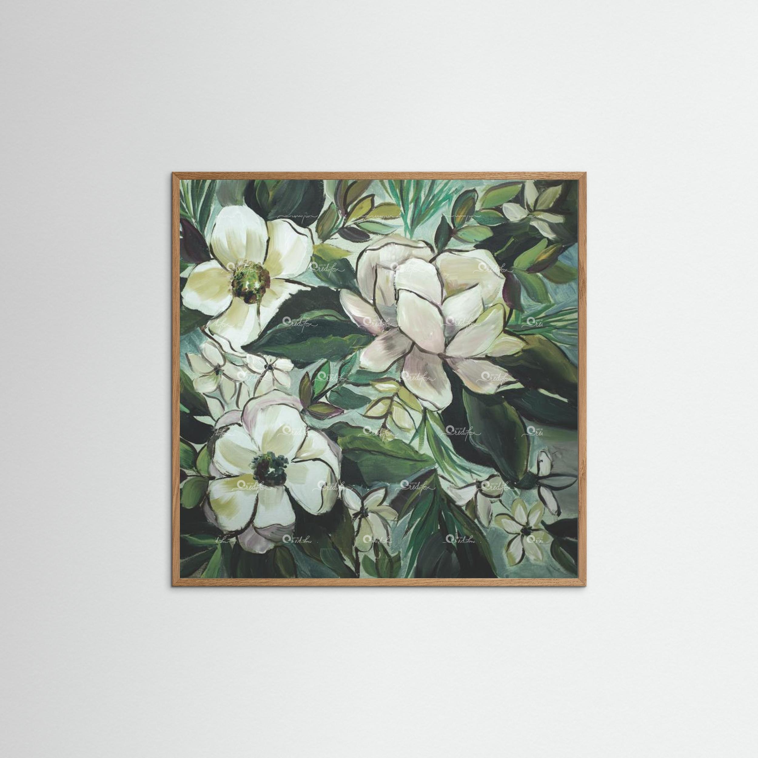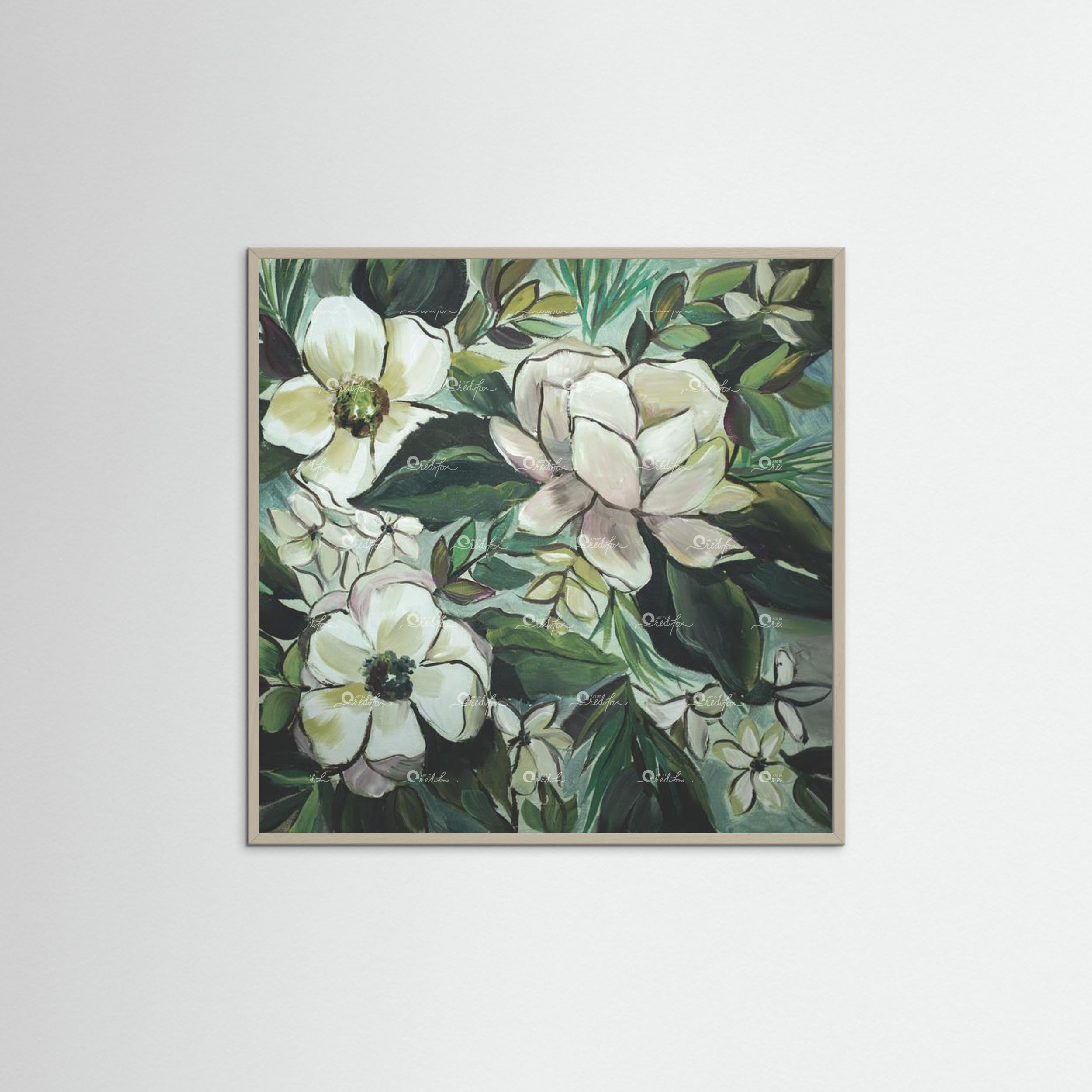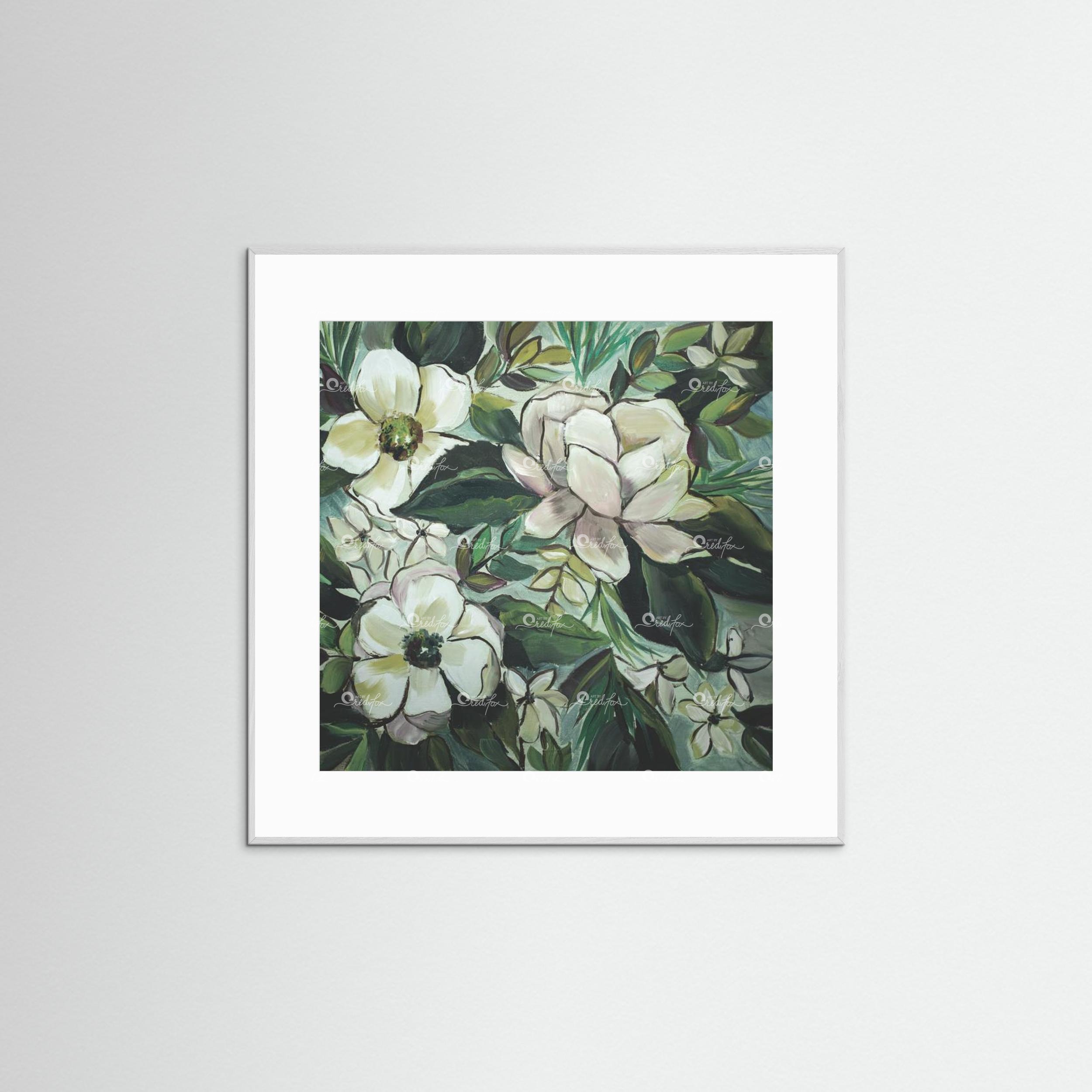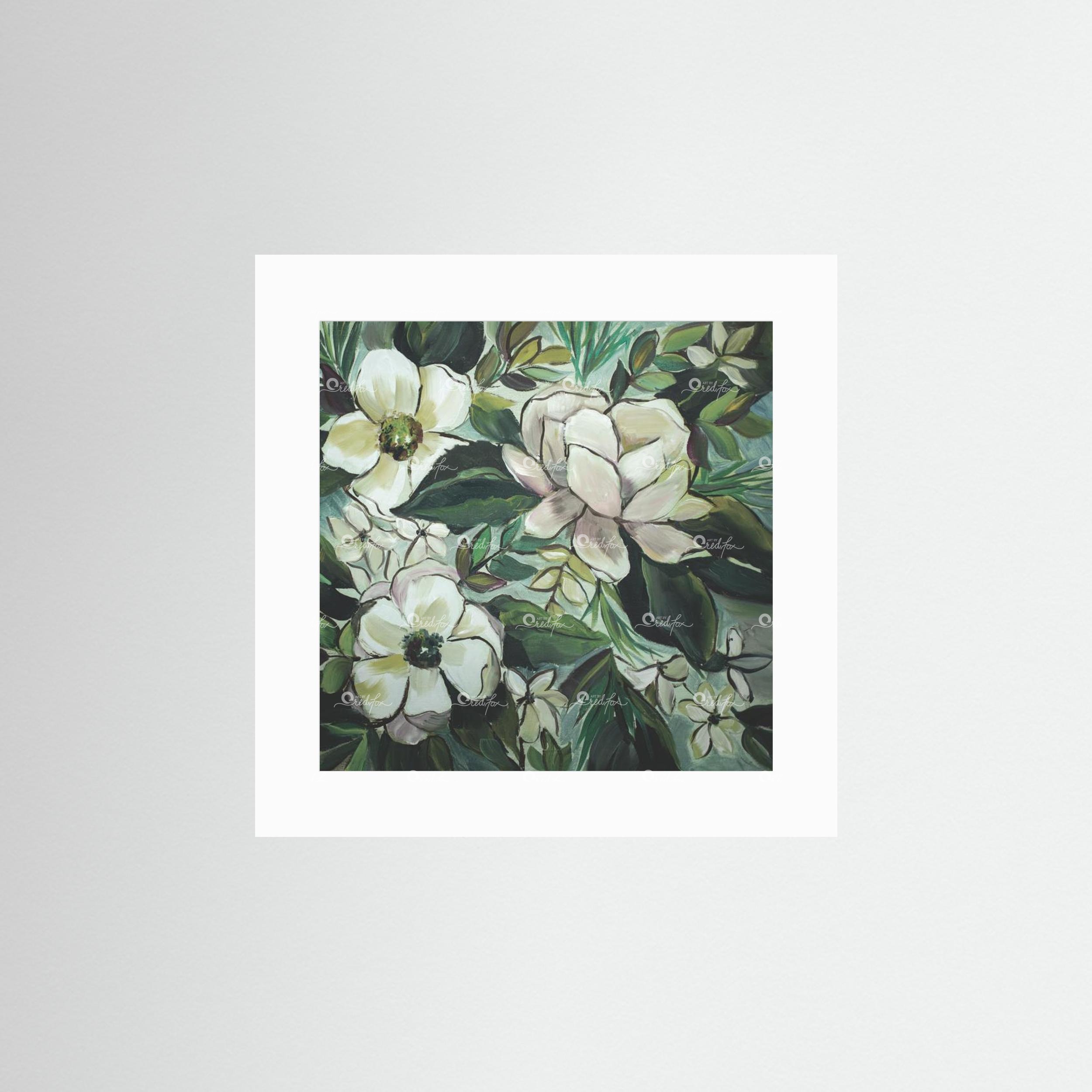 Note from the artist:“When I painted this, I was actually super frustrated. I needed something to help me simmer down. I pulled out my favorite colors of paint and began painting magnolias in spite of my feelings. Why? Because I love magnolias so much. They have calming lines, and are beautiful to behold. Did it work to calm me down? Yes. Yes, it did. Maybe you need a moment of calm in your life?”