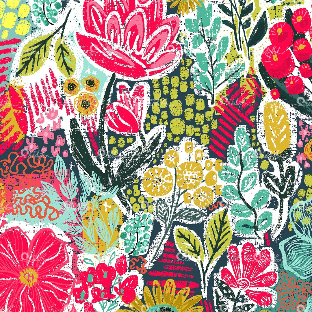 A celebration of confident mark-making and artistic flair, That Takes Talent is a bold floral seamless pattern brimming with hand-painted textures and vivid color. Packed with expressive botanicals, scratchy scribbles, and overlapping shapes, this design bursts with spontaneous energy—balancing structure with chaos in the most joyful way. Deep navy grounds the playful reds, mustards, teals, and greens, making it a standout choice for products that want to make a statement.